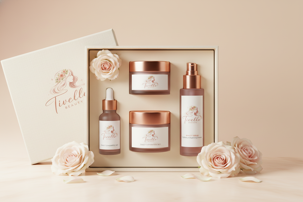 A 4-product daily set: SPF, antioxidant serum, bakuchiol cream, and overnight ceramide mask.